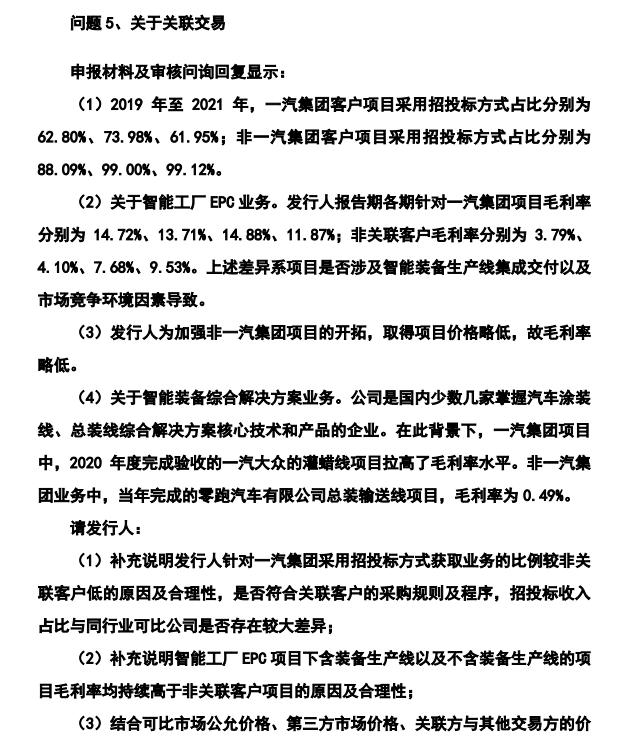 深交所在第2轮审核问询函中指出,2019年、2020年、2021年、2021年、2022年上半年,智能工厂EPC业务针对一汽集团项目毛利率分别为14.72%、13.71%、14.88%、11.87%,非关联客户毛利率分别为3.79%、4.10%、7.68%、9.53%。上述差异系项目是否涉及智能装备生产线集成交付以及市场竞争环境因素导致。另外,为加强非一汽集团项目的开拓,机械九院取得项目价格略低,故毛利率略低。对此,深交所要求机械九院结合可比市场公允价格、第三方市场价格、关联方与其他交易方的价格等,进一步论证关联交易的公允性,是否存在通过关联交易调节收入利润、成本费用以及其他利益安排的情形。