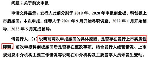首轮问询中,深交所要求公司说明前两次申报撤回的具体原因,是否存在发行上市实质性障碍;前次申报科创板撤回后是否存在整改事项,结合经营情况、上市规划及中介机构主要工作情况等说明在中介机构及主要签字人员未发生变动、财务数据未发生变动的情况下,保荐人尽职调查及辅导用时超过1年半的原因。