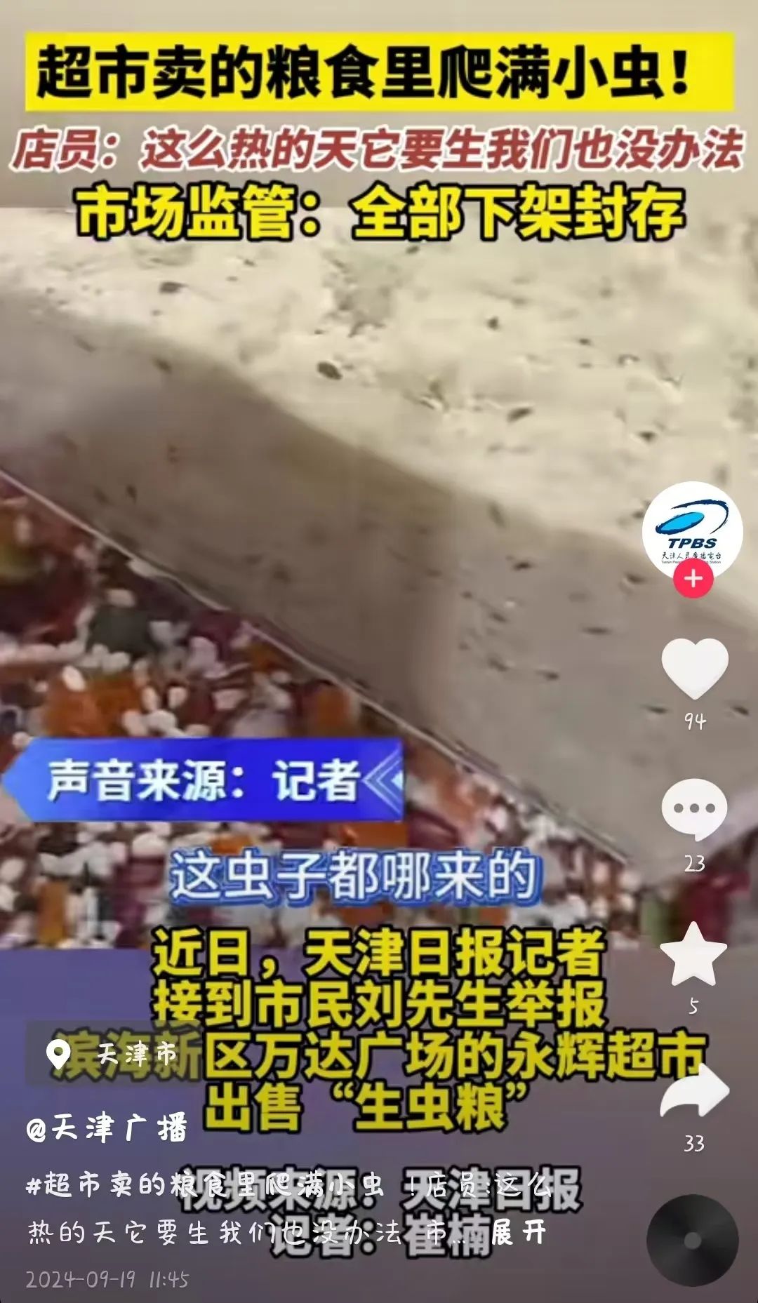 据天津日报报道,9月18日,记者接到市民举报,天津永辉超市滨海新区万达广场店出售“生虫粮”。目前,该店已被属地市场监管执法人员责令全部下架封存涉案产品,进一步调查正在进行中。