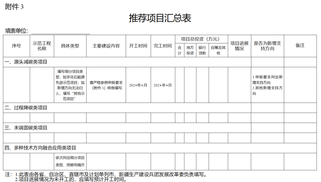 (四)示范工程项目汇总表(附件3)“主要建设内容”参照《绿色低碳先进技术示范项目清单(第一批)》填写,包括:项目类别(如“非化石能源先进示范项目”)+技术路线(项目采用××技术,破解××难题)+建设内容(主要建设××)+建设成效(项目投产后,可××,每年可减少碳排放约××万吨)。