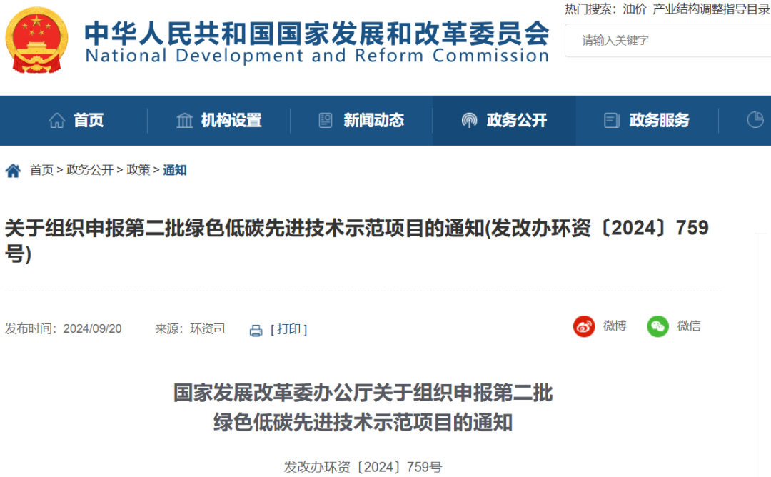 9月20日,国家发改委发布通知,启动第二批绿色低碳先进技术示范项目申报工作。各地区报送数量原则上不超过10个,中央企业申报项目由国务院国资委负责汇总报送。
