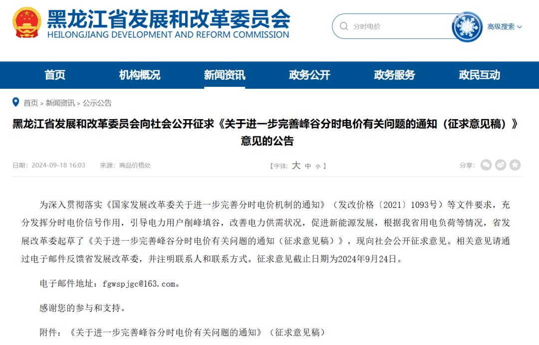 9月18日,黑龙江发改委向社会公开征求《关于进一步完善峰谷分时电价有关问题的通知(征求意见稿)》意见的公告,新增12:00-14:00为低谷时段,暂停执行尖峰电价。