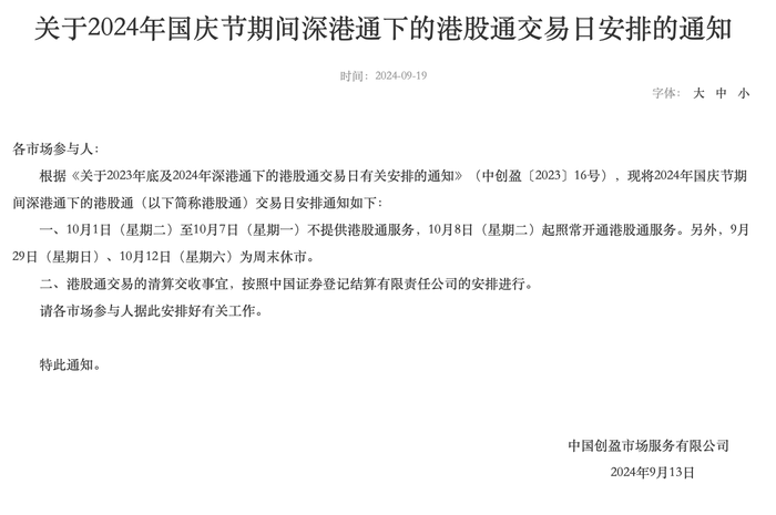 深交所9月19日发布2024年国庆节期间深港通下的港股通交易日安排,10月1日(星期二)至10月7日(星期一)不提供港股通服务,10月8日(星期二)起照常开通港股通服务。另外,9月29日(星期日)、10月12日(星期六)为周末休市。港股通交易的清算交收事宜,按照中国证券登记结算有限责任公司的安排进行。