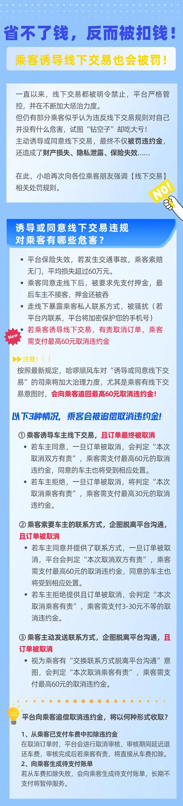 9月19日消息,哈啰顺风车今天发布紧急提醒:乘客诱导线下交易并取消订单,需交最高60元违约金。