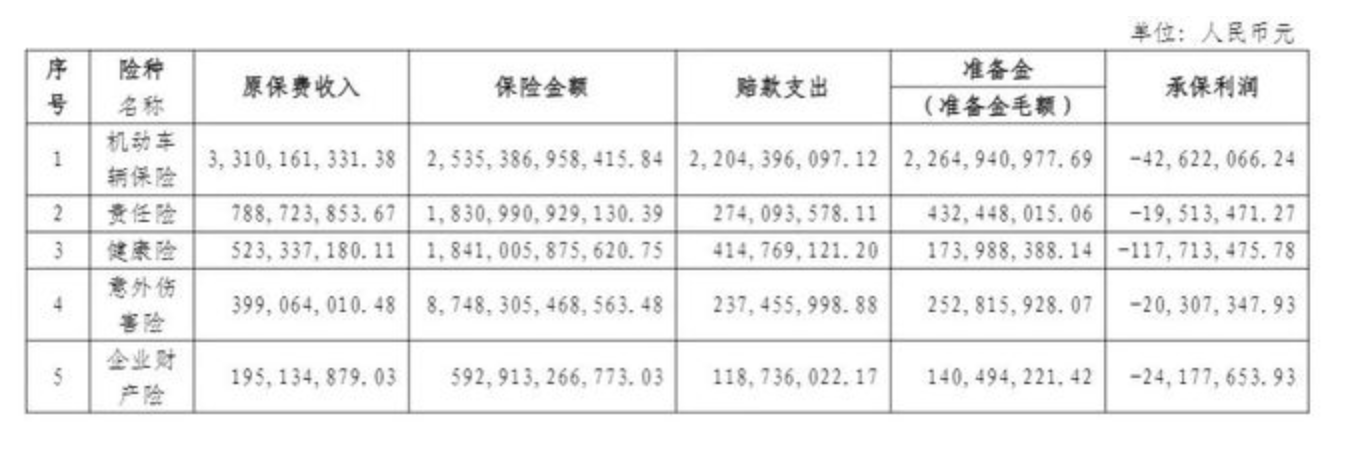 此外,根据2023年原保费收入前五名的商业保险险种经营信息,亚太财险前五大险种分别为车险、责任险、健康险、意外伤害险和企业财产险。不过,去年这五大险种均处于承保亏损状态,其中车险承保亏损0.43亿元,仅次于健康险。