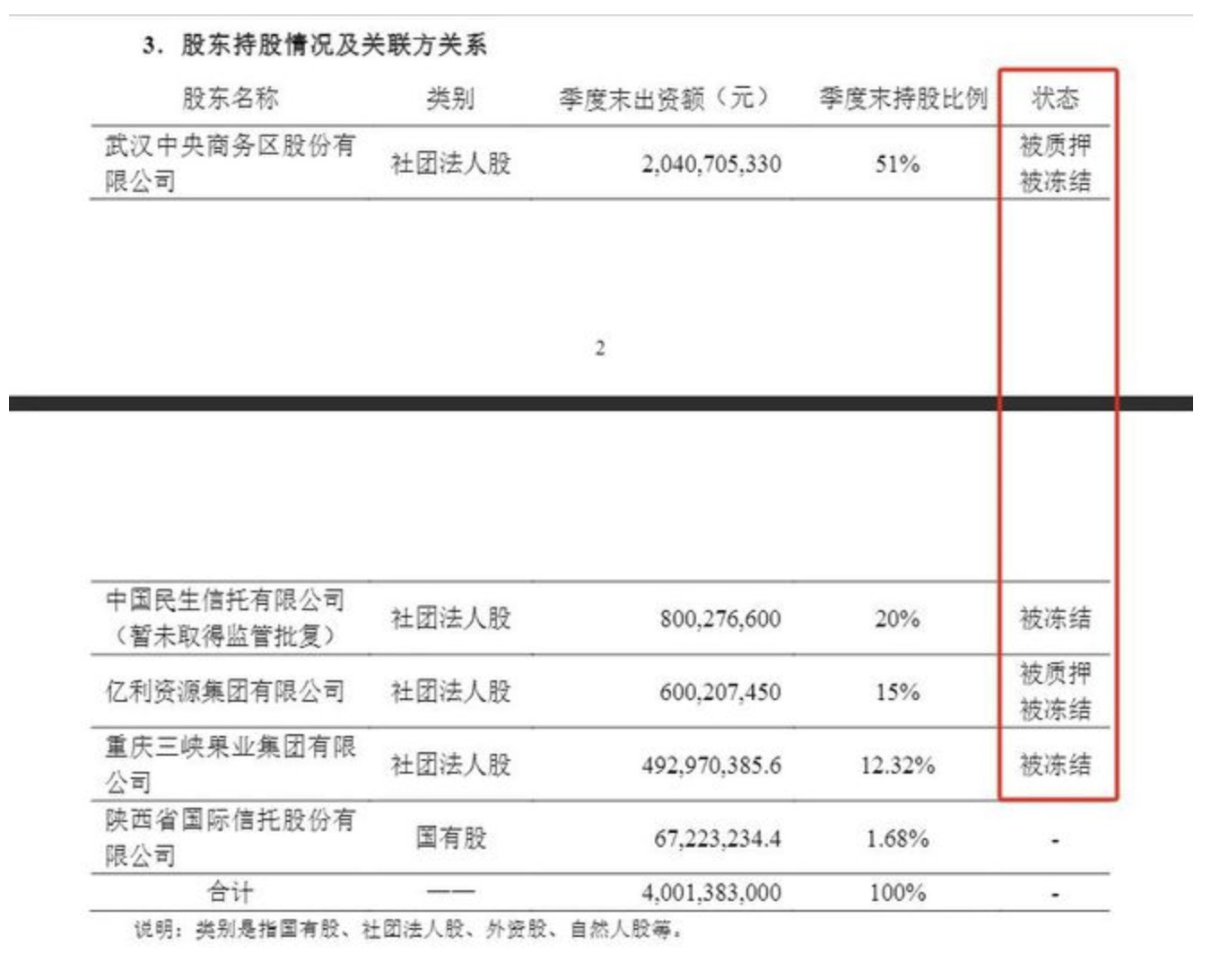 目前,亚太财险共有5家股东。其中,前四大股东武汉中央商务区股份有限公司(下称“武汉中央商务区”)、中国民生信托有限公司(暂未取得监管批复)、亿利资源集团有限公司、重庆三峡果业集团有限公司所持有的98.32%股权均被冻结或质押。