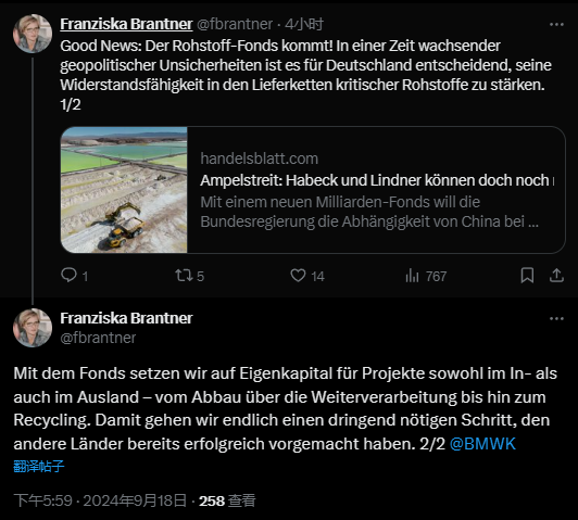 德国经济部议会国务秘书勃兰特内尔(Franziska Brantner)在社交媒体上写道,“好消息:原材料基金即将推出!在地缘政治不确定性日益加剧之际,德国必须加强其在关键原材料供应链中的应变能力。”