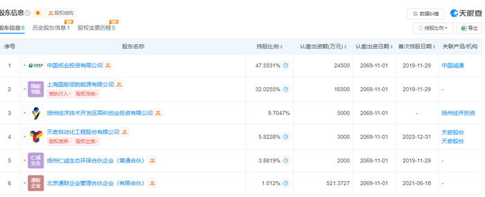 天眼查显示,2019年11月底,前述答复函提及的刘建国、屠红艳一致行动人上海国能领航成为中国诚通生态持股32.0255%的第二大股东,认缴出资额1.65亿元。同期,中国纸业、扬州仁诚生态环保合伙企业也投资中国诚通生态,分别认缴出资额2.45亿元、2000万元,持股比例47.5531%、3.8819%。上述股东于2021年12月31日完成实缴出资。