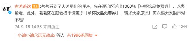 眼看网友依旧骂声依旧不断,古茗又急忙在道歉声明下表示要送出1000张「单杯饮品免费券」以表歉意,并在致歉声明最后放上抽奖链接。这才勉强平息下网友们的怒气。