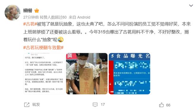 还有网友将古茗今年年初因为食品卫生问题被315点名的事拿出来批判,“不好好整改,玩什么抽象”。