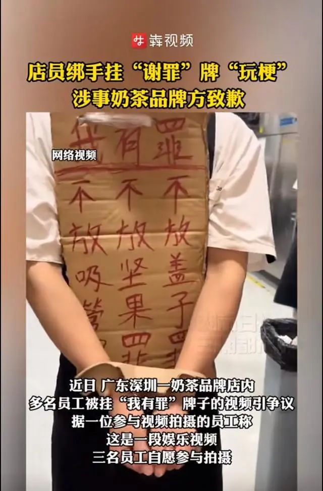 最近,“古茗奶茶员工谢罪”的视频在网上引发争议。视频中,一家古茗奶茶店内多名员工被挂“我有罪”的牌子,“罪名”分别有“打翻茶桶罪”“忘放吸管罪”“不放坚果罪”……有网友表示,此视频刺痛了“打工人”的心。