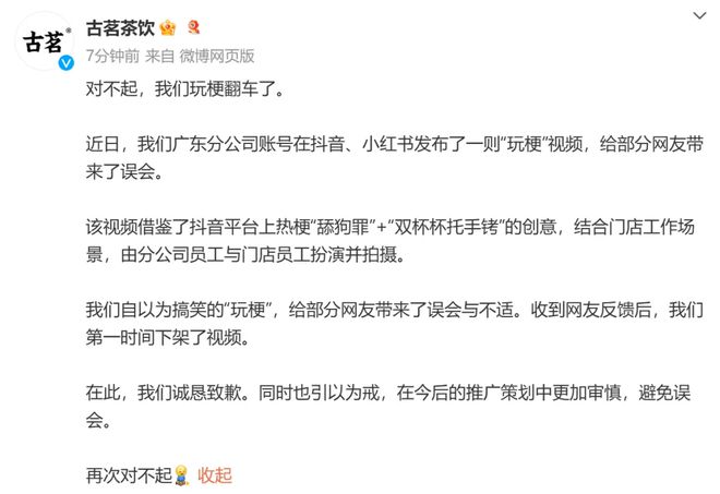 对此,9月18日,古茗茶饮在社交平台公开道歉:“对不起,我们玩梗翻车了。”古茗解释称,该视频借鉴了抖音平台上热梗“舔狗罪”和“双杯杯托手铐”的创意,由分公司员工与门店员工扮演并拍摄,给部分网友带来不适。古茗表示,收到网友反馈后第一时间下架了视频。同时,在今后的推广策划中会更加审慎,避免误会。
