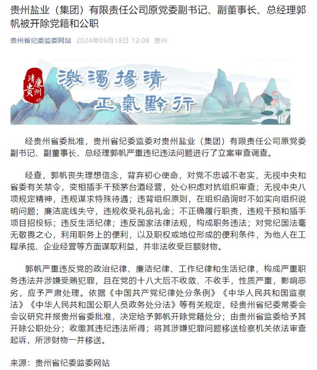 9月18日,据贵州省纪委监委网站消息:经贵州省委批准,贵州省纪委监委对贵州盐业(集团)有限责任公司原党委副书记、副董事长、总经理郭帆严重违纪违法问题进行了立案审查调查。