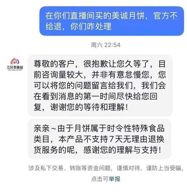 南财快讯记者以消费者身份咨询美诚月饼抖音平台的官方客服,美诚月饼客服人员表示月饼属于时令性特殊食品类目,商品不支持无理由退货退款。记者致电美诚月饼售后热线,但未能接通。