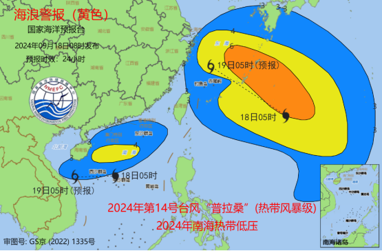 据自然资源部消息,2024年9月18日8时,今年第14号台风“普拉桑”(热带风暴级)中心位于琉球群岛那霸市东偏南方向约570公里的西北太平洋洋面上,中心附近最大风力9级(23米/秒)。预计“普拉桑”将以每小时45公里的速度向西北方向快速移动,强度变化不大,18日晚上移入东海东部海面,19日下午到晚上在浙江沿海登陆(热带风暴级或强热带风暴级,8~10级,20~25米/秒),之后强度逐渐减弱。