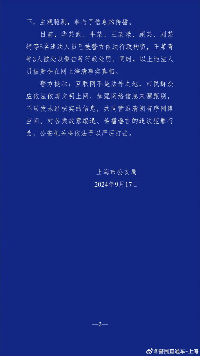 目前,华某武、牛某、王某琭、顾某、刘某绮等5名违法人员已被警方依法行政拘留,王某青等3人被处以警告等行政处罚。同时,以上违法人员被责令在网上澄清事实真相。