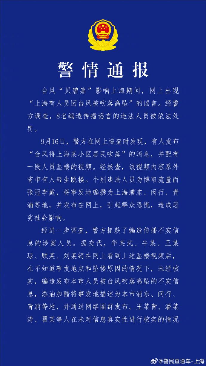 中新网9月18日电 据上海市公安局官方微博消息,台风“贝碧嘉”影响上海期间,网上出现“上海有人员因台风被吹落高坠”的谣言。经警方调查,8名编造传播谣言的违法人员被依法处罚。