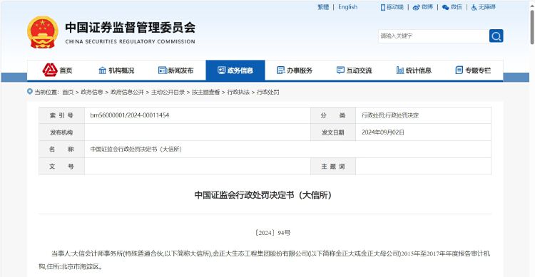 日前,证监会公布行政处罚决定书,大信会计师事务所(特殊普通合伙,以下简称“大信所”)应对金正大2015年至2017年年报审计未勤勉尽责,被没收业务收入201.89万元,并处以403.77万元罚款。同时,证监会对金正大2015年至2017年年度报告审计签字注册会计师吴某锋、高某涛给予警告,并分别处以5万元罚款。