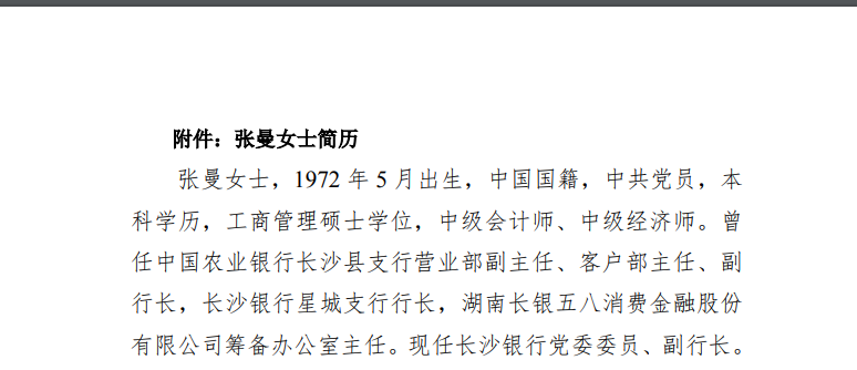 简历显示:张曼女士,1972年5月出生,中国国籍,中共党员,本科学历,工商管理硕士学位,中级会计师、中级经济师。曾任中国农业银行长沙县支行营业部副主任、客户部主任、副行长,长沙银行星城支行行长,湖南长银五八消费金融股份有限公司筹备办公室主任。现任长沙银行党委委员、副行长。