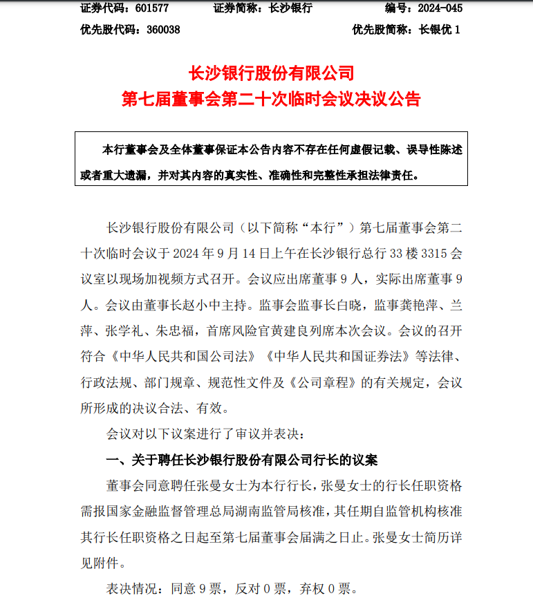 9月17日,长沙银行(SH601577,前收盘价6.61元,市值265.8亿元)发布公告称,该行第七届董事会第二十次临时会议审议通过关于聘任长沙银行行长的议案,同意聘任张曼为该行行长,任职资格需报国家金融监督管理总局湖南监管局核准,其任期自监管机构核准其行长任职资格之日起至第七届董事会届满之日止。