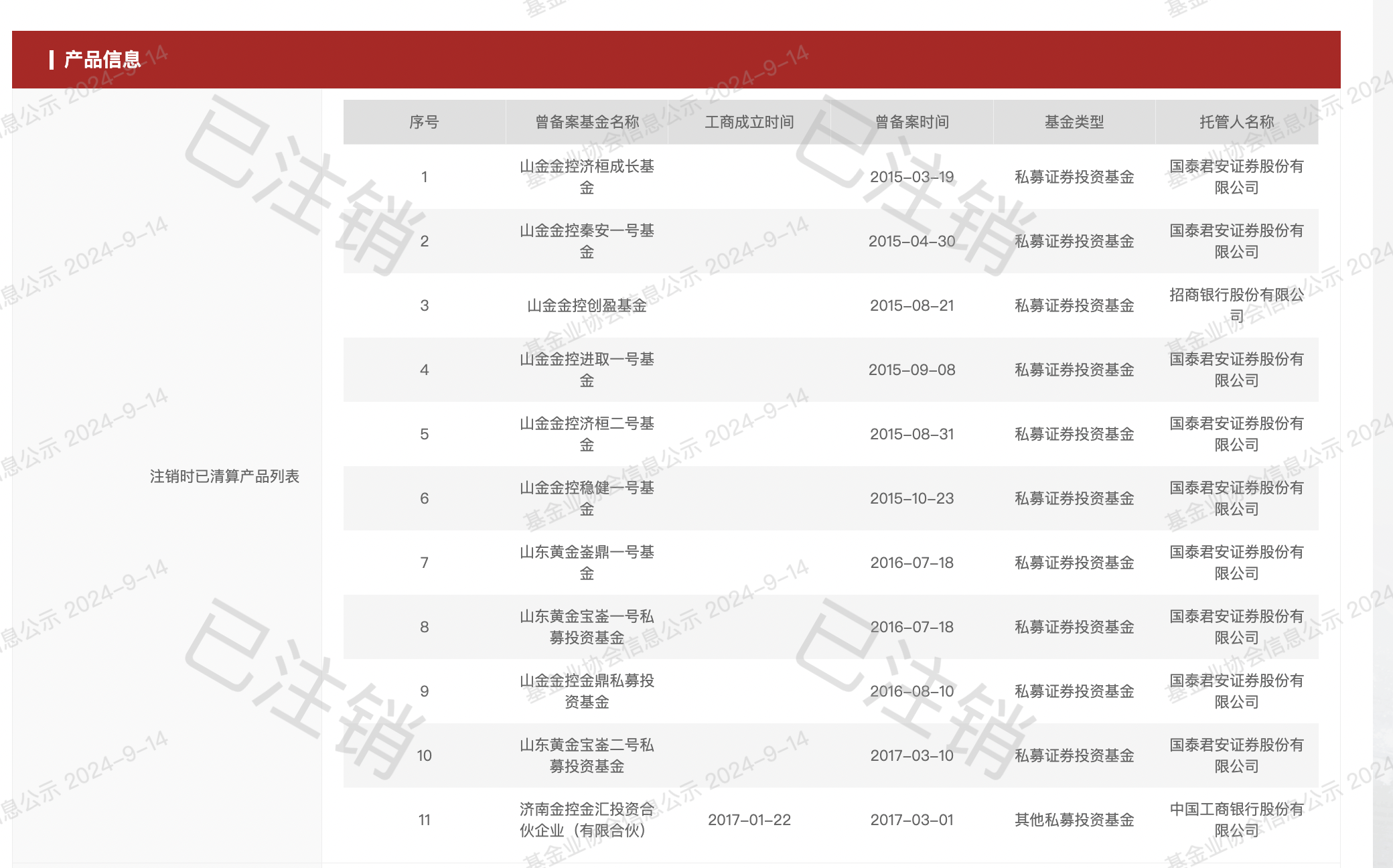 上市公司山东黄金全资控股的山金金控,成立已近12年,9月10日因12个月无在管注销。山金金控登记为私募股权、创投基金,旗下多家控股子公司,涉及私募证券投资基金、期货公司、贵金属投资等,还参股证券公司。山东黄金半年报显示,山金金控总资产为171.45亿元、净资产为22.1亿元。据过往年报,山金金控曾在2021年为山东黄金贡献7.25亿元净利润,又在2020年亏损了3.1亿元。