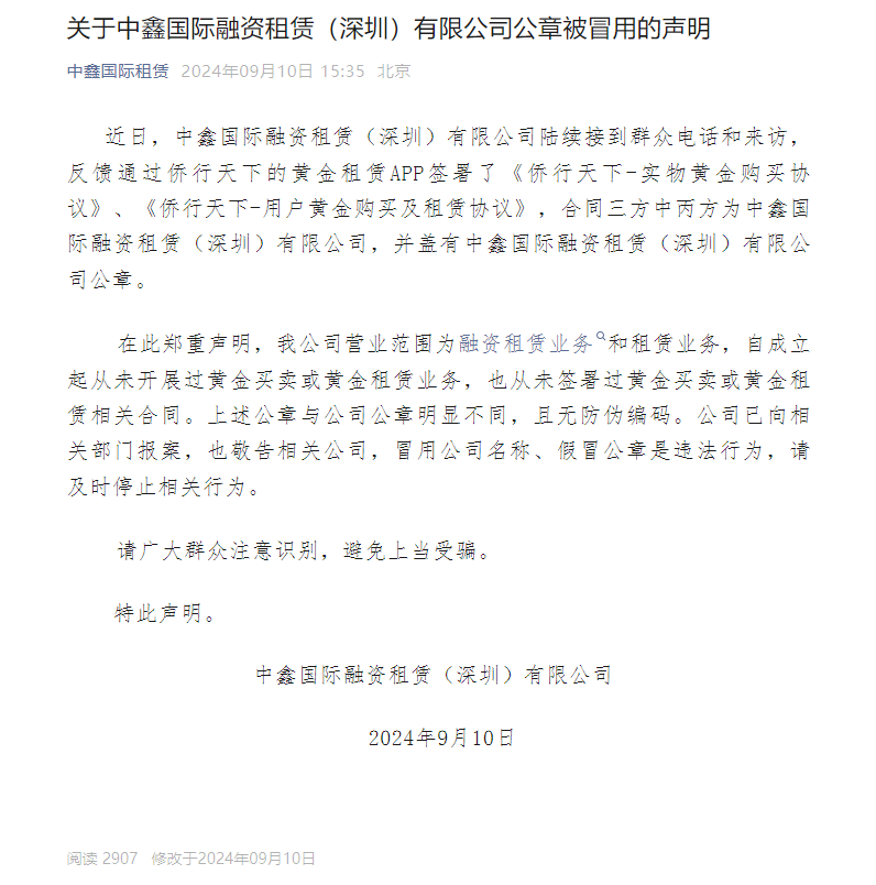红星资本局注意到,9月10日,中鑫国际官方微信公众号发布声明称,公司营业范围为融资租赁业务和租赁业务,自成立起从未开展过黄金买卖或黄金租赁业务,也从未签署过黄金买卖或黄金租赁相关合同。上述《协议》中盖有的“中鑫国际公章”与公司公章明显不同,且无防伪编码。公司已向相关部门报案。