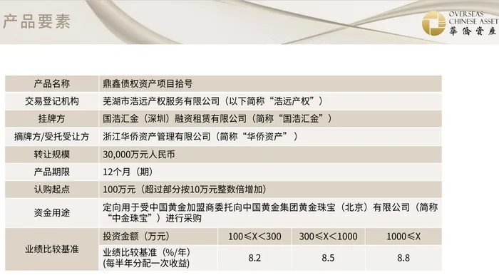 鼎鑫债权资产项目拾号产品说明书显示,产品挂牌方是国浩汇金(深圳)融资租赁有限公司(以下简称“国浩汇金”),摘牌方/受托受让方是华侨资产。