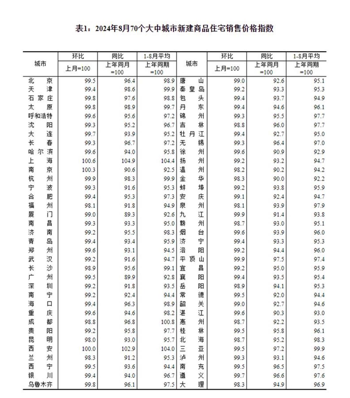 9月14日上午,国家统计局公布了2024年8月份70个大中城市住房价格指数。8月份,70个大中城市中,各线城市商品住宅销售价格环比下降、同比降幅总体略有扩大,其中一线城市新建商品住宅销售价格环比降幅收窄、同比降幅与上月相同。