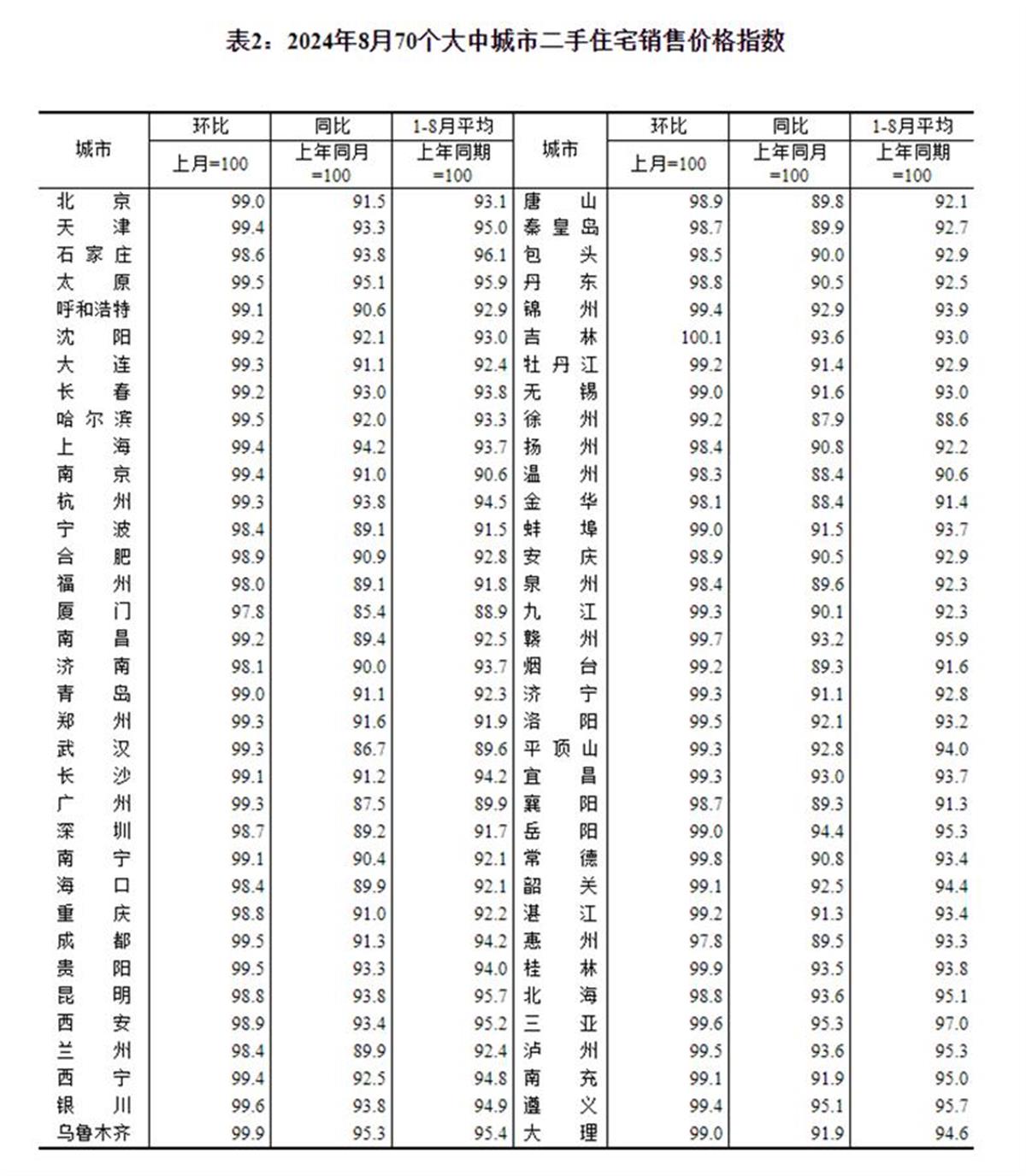 8月份,一线城市二手住宅销售价格同比下降9.4%,降幅比上月扩大0.6个百分点,其中北京、上海、广州和深圳分别下降8.5%、5.8%、12.5%和10.8%。二、三线城市二手住宅销售价格同比分别下降8.6%和8.5%,降幅均比上月扩大0.4个百分点。
