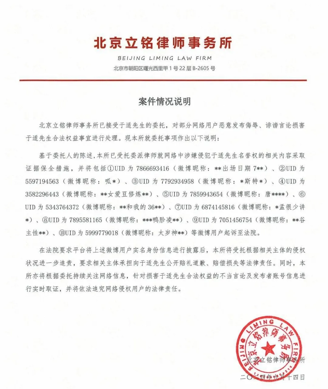 声明称,针对传播、损害情节严重的微博用户,已委托律师完成调查取证工作。将对公开、传播相关内容的主体依法追究法律责任,包括但不限于提起民事诉讼及刑事报案。