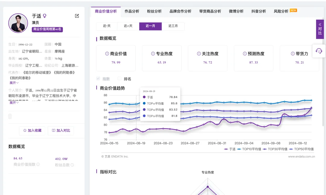据艺恩星数,截至9月14日,于适的商业价值指数为79.99,在商业价值周榜排第12名。