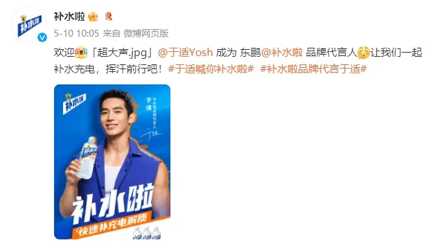 5月11日,A股上市公司东鹏饮料旗下品牌“补水啦”宣布青年演员于适为首位代言人,强化品牌形象。