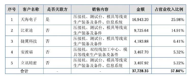 2022年、2023年,海昌智能向前五名客户的销售收入占总营收的比例分别为63.66%、57.84%。其中,天海电子为海昌智能第一大客户,同时也是海昌智能的关联方。