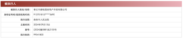 中国执行信息公开网显示,9月13日,碧桂园地产集团有限公司及旗下章丘市碧桂园房地产开发有限公司新增一则被执行人信息,执行标的9954万余元,涉及合资、合作开发房地产合同纠纷案件,执行法院为曲阜市人民法院。