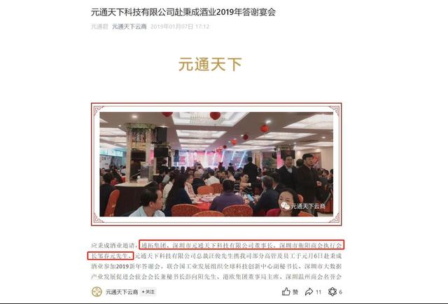 同时,微信公众号“元通天下云商”2019年1月7日发布的《元通天下科技有限公司赴秉成酒业2019年答谢宴会》文章中也提到邹春元当时的另一身份:“通拓集团、深圳市元通天下科技有限公司董事长、深圳市衡阳商会执行会长邹春元。”