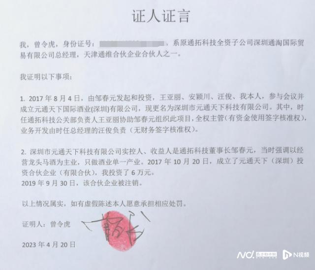 就邹春元的身份,据朱学军提供的一张“证人证言”照片显示,深圳市元通天下科技有限公司实际控制人、受益人是通拓科技董事长邹春元,当时强调以经营龙马酒业为主,只做酒业单一产业。2017年10月20日,成立了元通天下(深圳)投资合伙企业(有限合伙)。