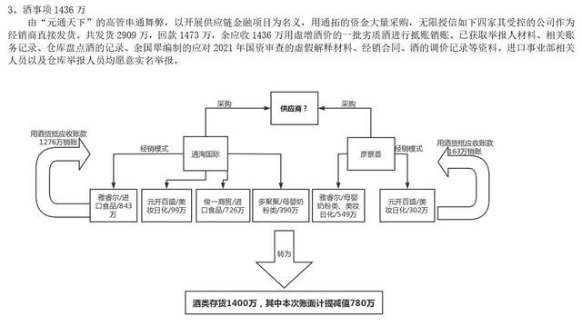 朱学军提供的文件显示,审计组初步调查认定,“由于‘元通天下’的高管串通舞弊,以开展供应链金融项目为名义,用通拓的资金大量采购,无限授信四家其受控的公司作为经销商直接发货,共发货2909万元,回款1473万元,剩余应收1436万元用虚增价格的一批劣质酒进行抵账销账,收集整理汇总的材料包括但不限于举报人材料、相关账务记录、仓库盘点酒的记录、余国翠编制的应对2021年国资审查的虚假解释材料、经销合同、酒的调价记录等资料。”