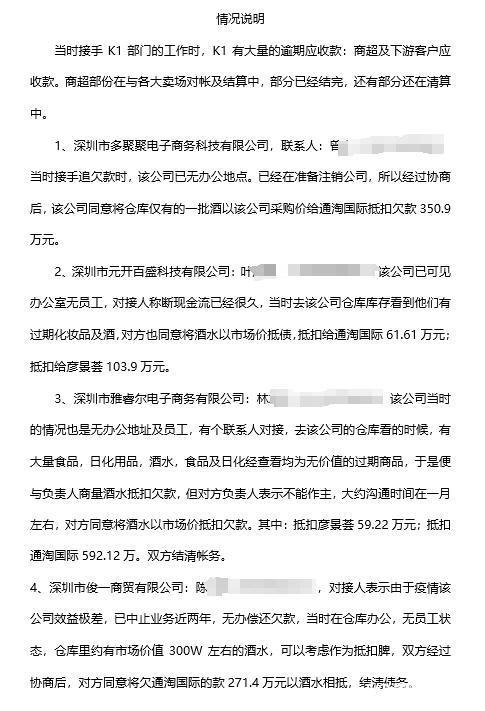 文件还显示,多聚聚、元开百盛、雅睿尔、俊一商贸四家公司作为经销商分别向通淘国际采购进口了食品843万元、美妆日化99万元、进口食品726万元、母婴奶粉类产品390万元,四家公司用酒货抵应收账款1276万元销账。