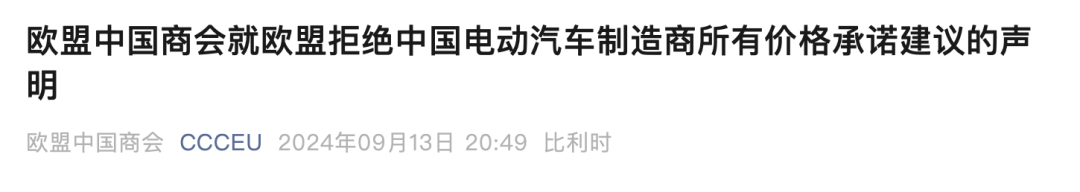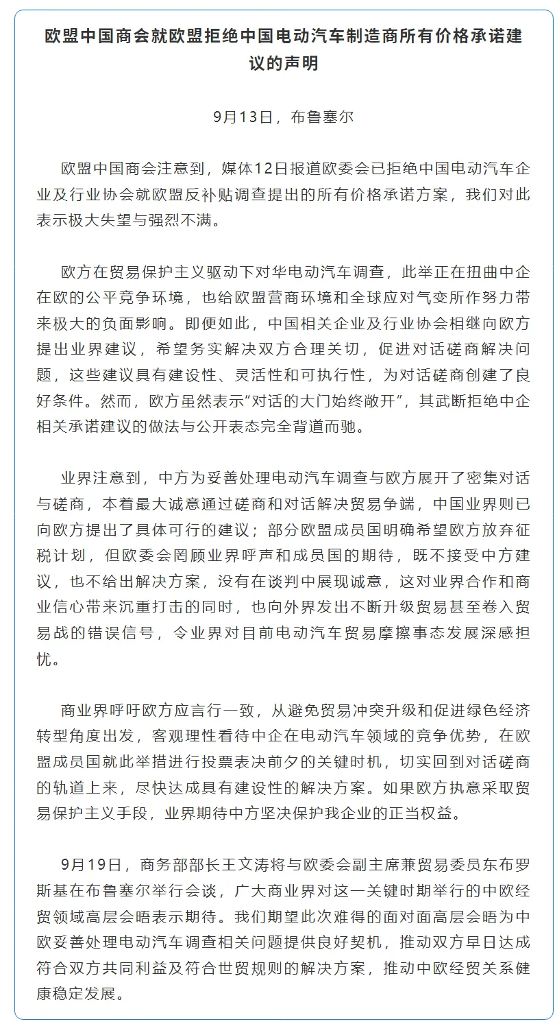 欧盟中国商会注意到,媒体12日报道欧委会已拒绝中国电动汽车企业及行业协会就欧盟反补贴调查提出的所有价格承诺方案,我们对此表示极大失望与强烈不满。