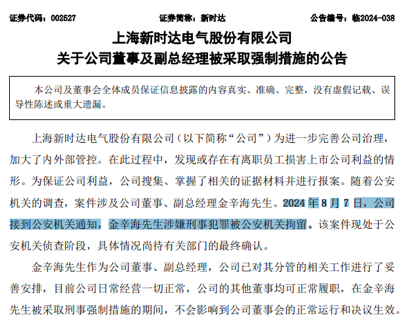 8月10日晚,新时达披露,公司董事及副总经理被采取强制措施。公告显示,公司为进一步完善公司治理,加大了内外部管控。在此过程中,发现或存在有离职员工损害上市公司利益的情形。为保证公司利益,公司搜集、掌握了相关的证据材料并进行报案。