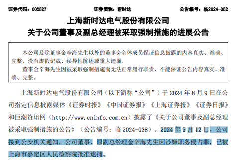 9月13日晚,新时达公告称,公司于12日接到公安机关通知,公司董事、原副总经理金辛海因涉嫌职务侵占罪,已被上海市嘉定区人民检察院批准逮捕。