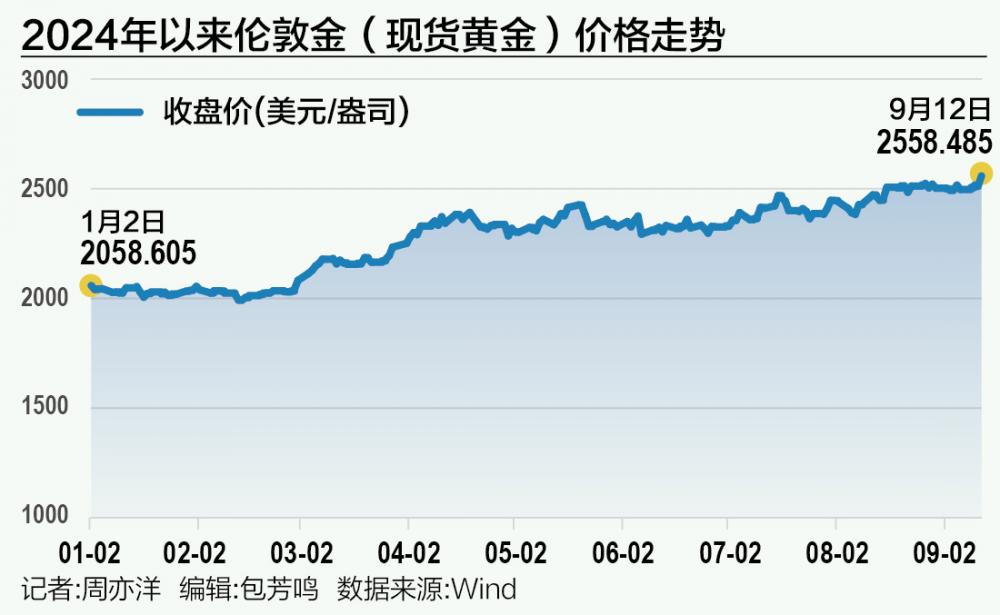 期市方面,同花顺数据显示,9月13日COMEX黄金期货盘中也快速拉涨,截至记者发稿,一度涨至2599.2美元/盎司的高位,距离2600美元/盎司的整数关口,仅一步之遥。8月份至今,本轮COMEX黄金期货已累计上涨近120美元,涨幅超过4.8%,年内涨幅超过25%。