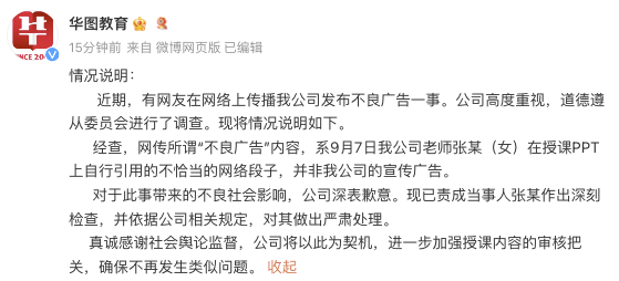 经查,网传所谓“不良广告”内容,系9月7日公司老师张某(女)在授课PPT上自行引用的不恰当的网络段子,并非我公司的宣传广告。对于此事带来的不良社会影响,公司深表歉意。现已责成当事人张某作出深刻检查,并依据公司相关规定,对其做出严肃处理。
