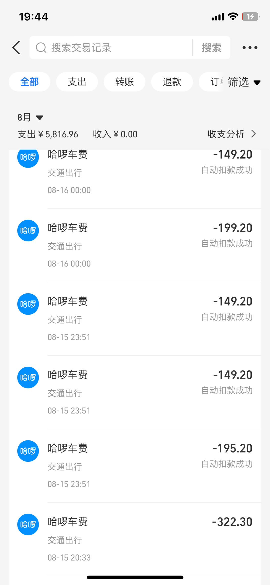 8月15日到21日,乘客哈啰账户被莫名扣款21笔
