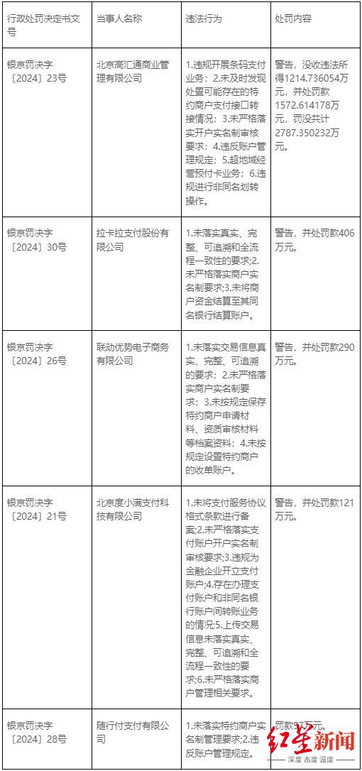 红星新闻记者获悉,收到罚单最高的是高汇通。央行公布的处罚决定书显示,高汇通的违法行为涉及六项,包括违规开展条码支付业务、未严格落实开户实名制审核要求、超地域经营预付卡业务、违规进行非同名划转操作等,央行最终作出了警告,没收违法所得1214万余元,并处罚款1572万余元,累计罚没约2787.35万元。同时,拉卡拉因三项违法行为被警告,并处罚没406万元;联动优势因四项违法行为被警告,并罚款290万元;度小满因六项违法行为被警告,并罚款121万元;随行付两项违法行为被罚款57万元。据了解,5家支付机构时任相关负责人也受到了不同程度的处罚。