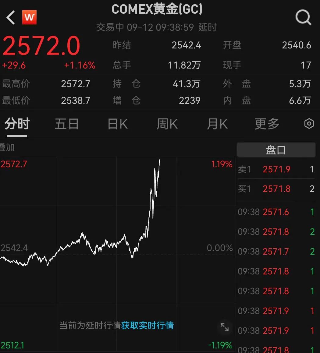 截至9月12日21时30分左右,国际金价再创历史高点,突破2572美元/盎司!