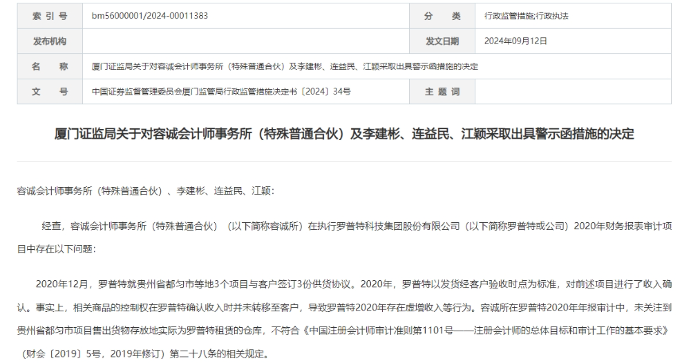 9月12日,因涉及罗普特(688619.SH)IPO,国金证券、容诚会计师事务所(特殊普通合伙)(简称容诚所)收到厦门证监局出具的监管警示函。