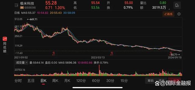 业绩持续下滑引发股价震荡下跌。9月10日,极米科技报收55.28元/股,股价相较历史高点跌去九成,市值蒸发超过300亿元。