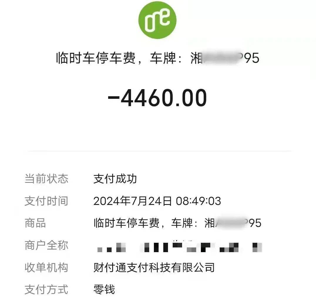 王先生是一名空调维修师傅,7月24日,他到长沙县荣盛城小区给一户主安装空调,在小区地下车库停车1小时,“早上7点多进车库,装完空调8点40分,我出来扫码,语音播报是扣5块钱,当时我没注意输了密码,发现扣了我4460元。”