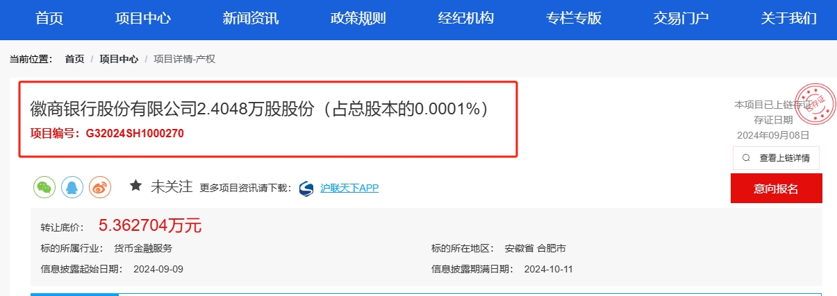 9月9日,上海联合产权交易所显示,徽商银行股份有限公司(简称“徽商银行”)2.4048万股股份(占总股本的0.0001%)今日起公开挂牌转让,挂牌转让底价为5.362704万元。此次推算,徽商银行股权最新挂牌转让价格约合每股2.23元。